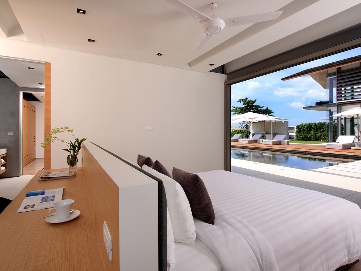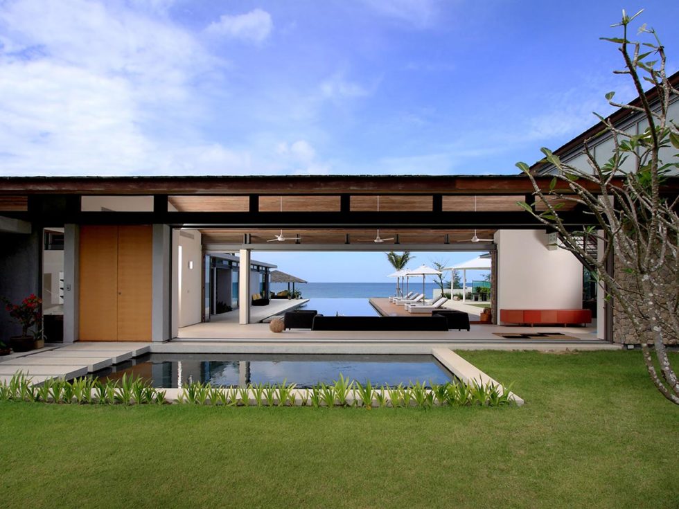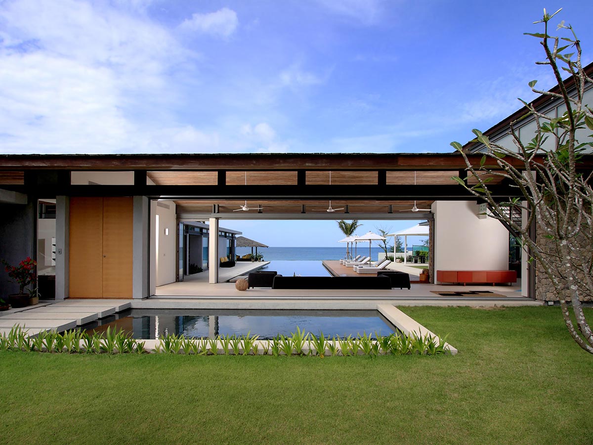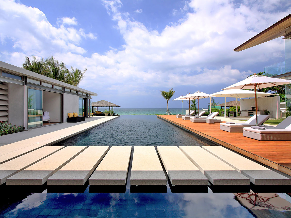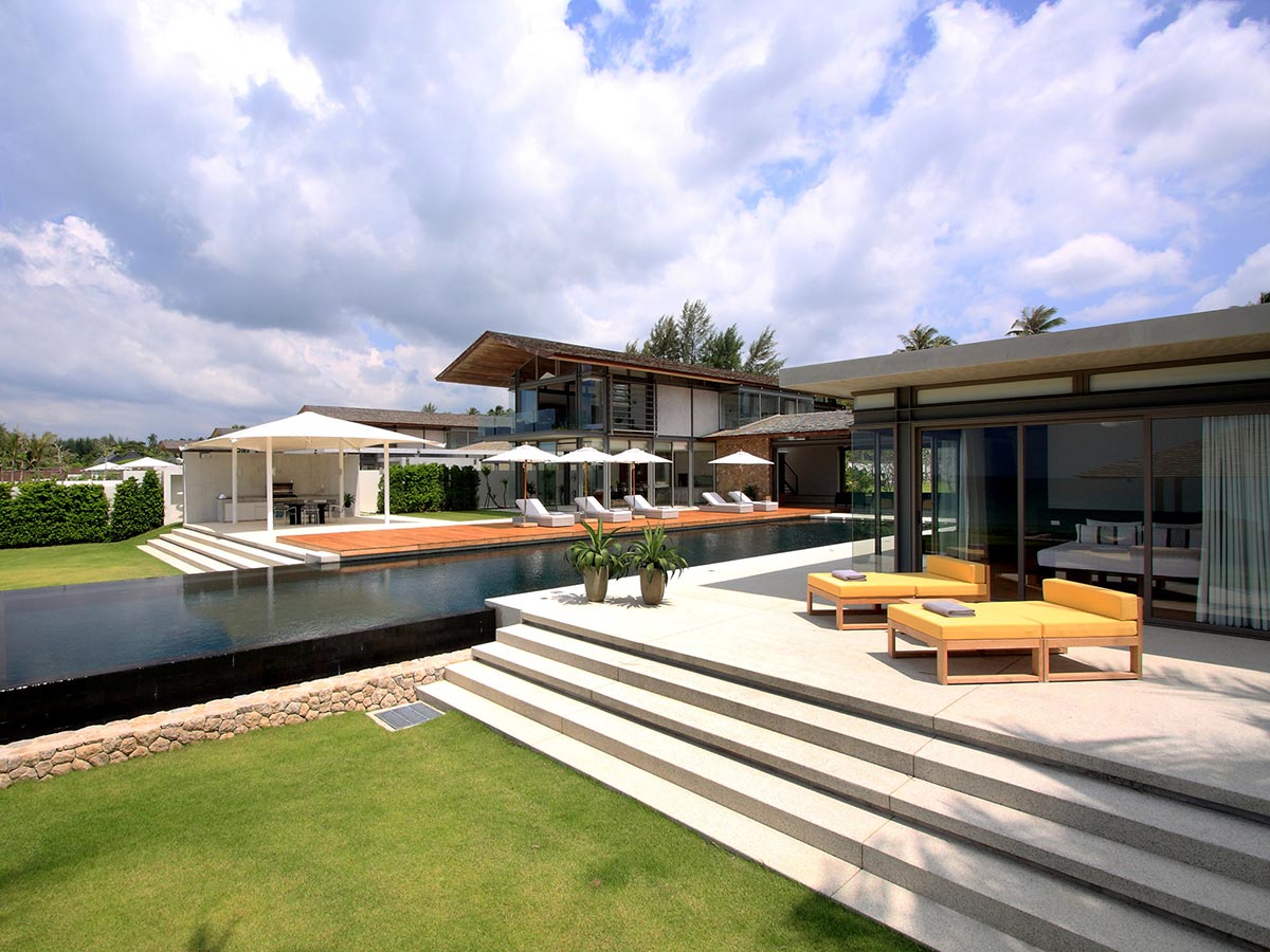 The U-shaped villa’s chic bedroom suites and open-plan living and dining areas wrap around a 25-meter pool, surrounded by ample terracing and lawns for outdoor entertaining. Guests are lavished with attention from a team of full-time staff that includes a villa manager and a skilled Thai chef. A wealth of leisure facilities are available for guest use, including a pool table, surfboards, and football and volleyball equipment.