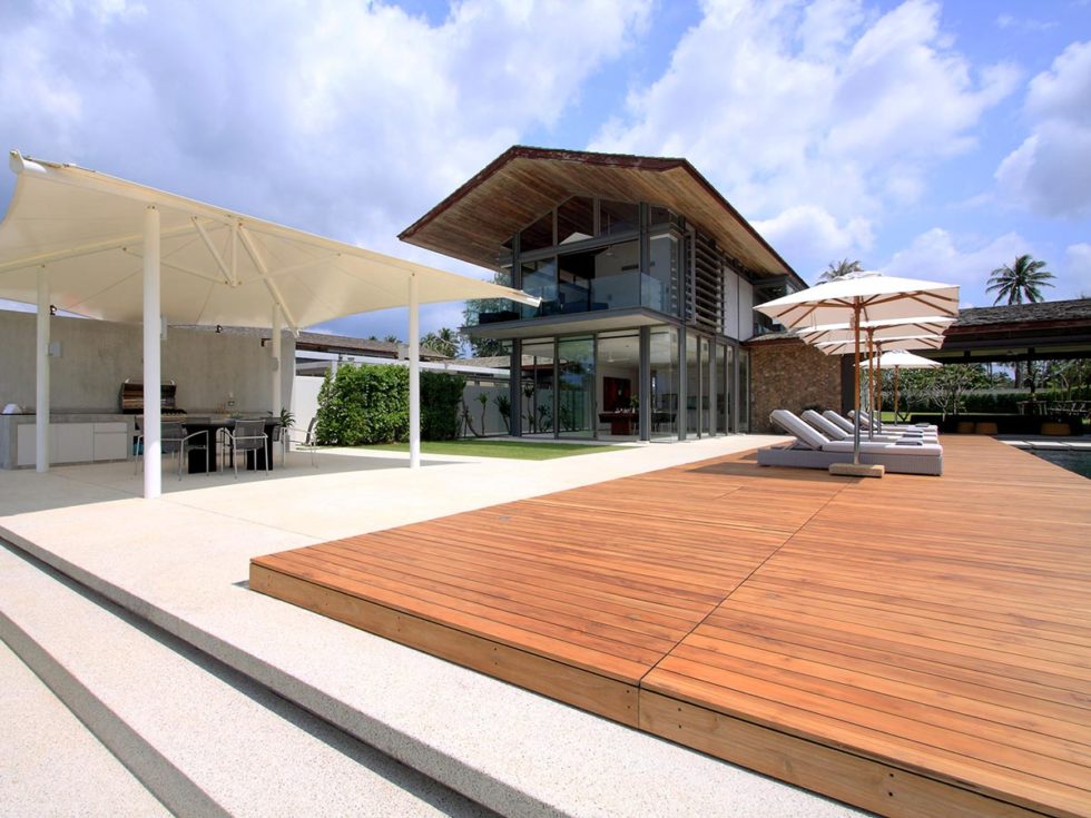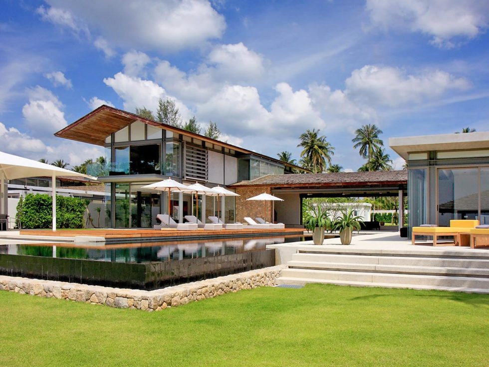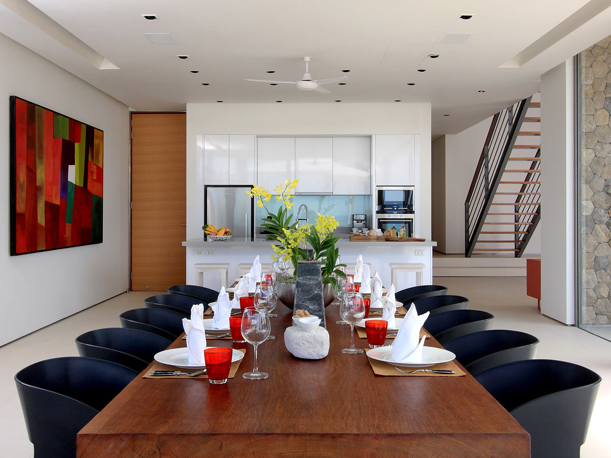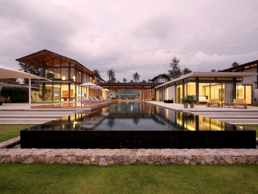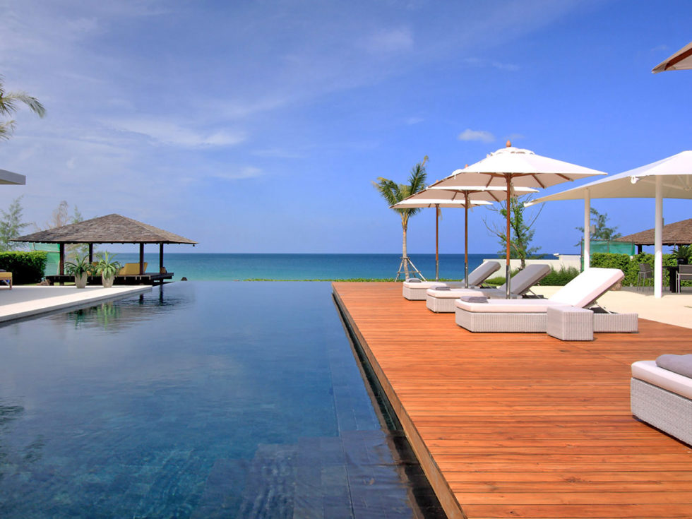 The U-shaped villa’s chic bedroom suites and open-plan living and dining areas wrap around a 25-meter pool, surrounded by ample terracing and lawns for outdoor entertaining. Guests are lavished with attention from a team of full-time staff that includes a villa manager and a skilled Thai chef. A wealth of leisure facilities are available for guest use, including a pool table, surfboards, and football and volleyball equipment.