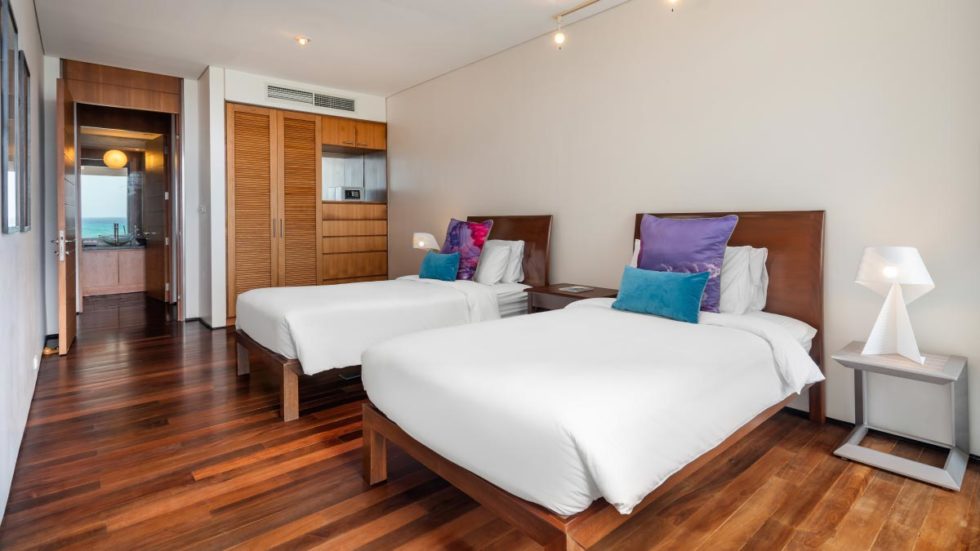 Guest Bedroom 4 – Two single beds or king-size bed; Ocean, sunset and garden view; Shared terrace with Guest Bedroom 2; Closet; Air conditioning; Safety box; Separate bathroom shared with Guest Bedroom 5 – bathtub & shower, double vanities, and toilet; Toiletries; Hairdryer; Slippers; Bathrobes; Umbrellas